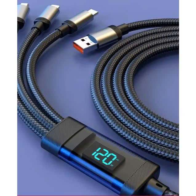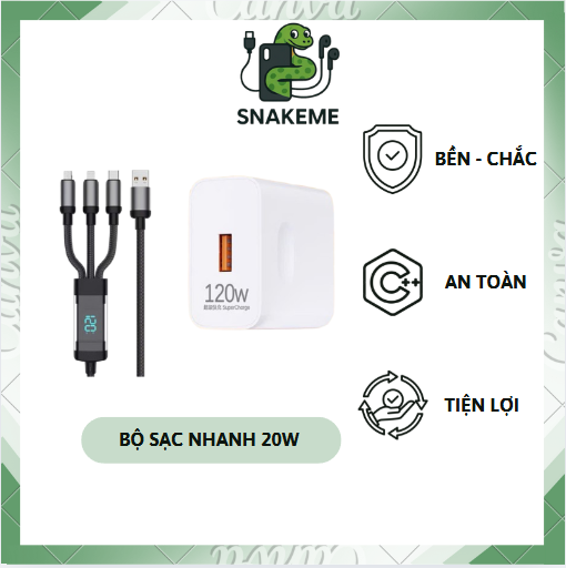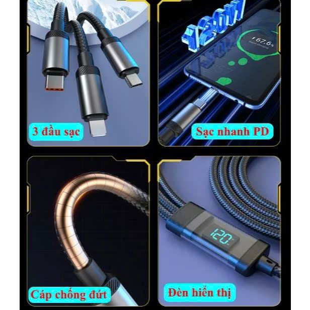 Bộ Sạc Nhanh 120W Cáp Sạc Nhanh 3 Đầu Tự Ngắt, Dài 2m Chống Đứt Cao Cấp Dùng Cho Mọi Điện hoại